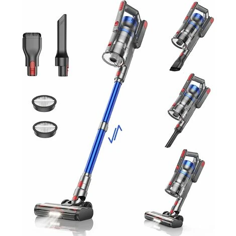 - 【Accessori multifunzionali】Le funzionali caratteristiche includono luci a LED anteriori per illuminare i punti scuri, un tubo telescopico con lunghezza regolabile (42-65 cm), spazzola per pavimenti girevole a 180° in orizzontale/90° in verticale, e un accessorio multifunzionale per la pulizia. Con una sola mano puoi usare l’aspirapolvere senza filo per pulire le scale, sotto e dietro i mobili