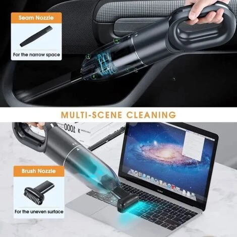 - 5.①Dimensioni del prodotto: 34 x 9 x 12 cm.②Motore con nucleo in rame da 120 W, super aspirazione da 8,5 kpa.③Batteria incorporata di grande capacità da 2600 mAh, completamente carica in 3-4 ore, uso continuo per 30 minuti dopo una carica completa.④ Filtro HEPA lavabile durevole, sicuro da usare.⑤Forniamo un cavo USB, è possibile utilizzare l’adattatore per telefono cellulare per caricare.