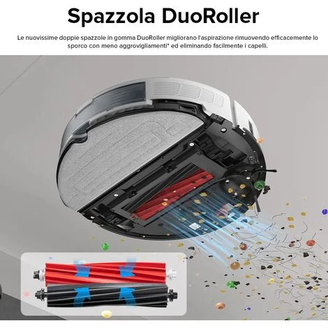 Haute AspirationPuissance d’aspiration maximale jusqu’à 6 000 Pa—Grâce à la amélioration de puissance d’aspiration HyperForce®, votre aspirateur robot peut aspirer toutes les saletés et poussières puisqu’elle le rend même capable d’éliminer les particules les plus fines sans effort. | Brosse DuoRoller™Double brosses en caoutchouc—La toute nouvelle Brosse DuoRoller™ améliore l’aspiration et élimine efficacement la saleté tout en réduisant les enchevêtrements et en faisant facilement disparaître les poils. |